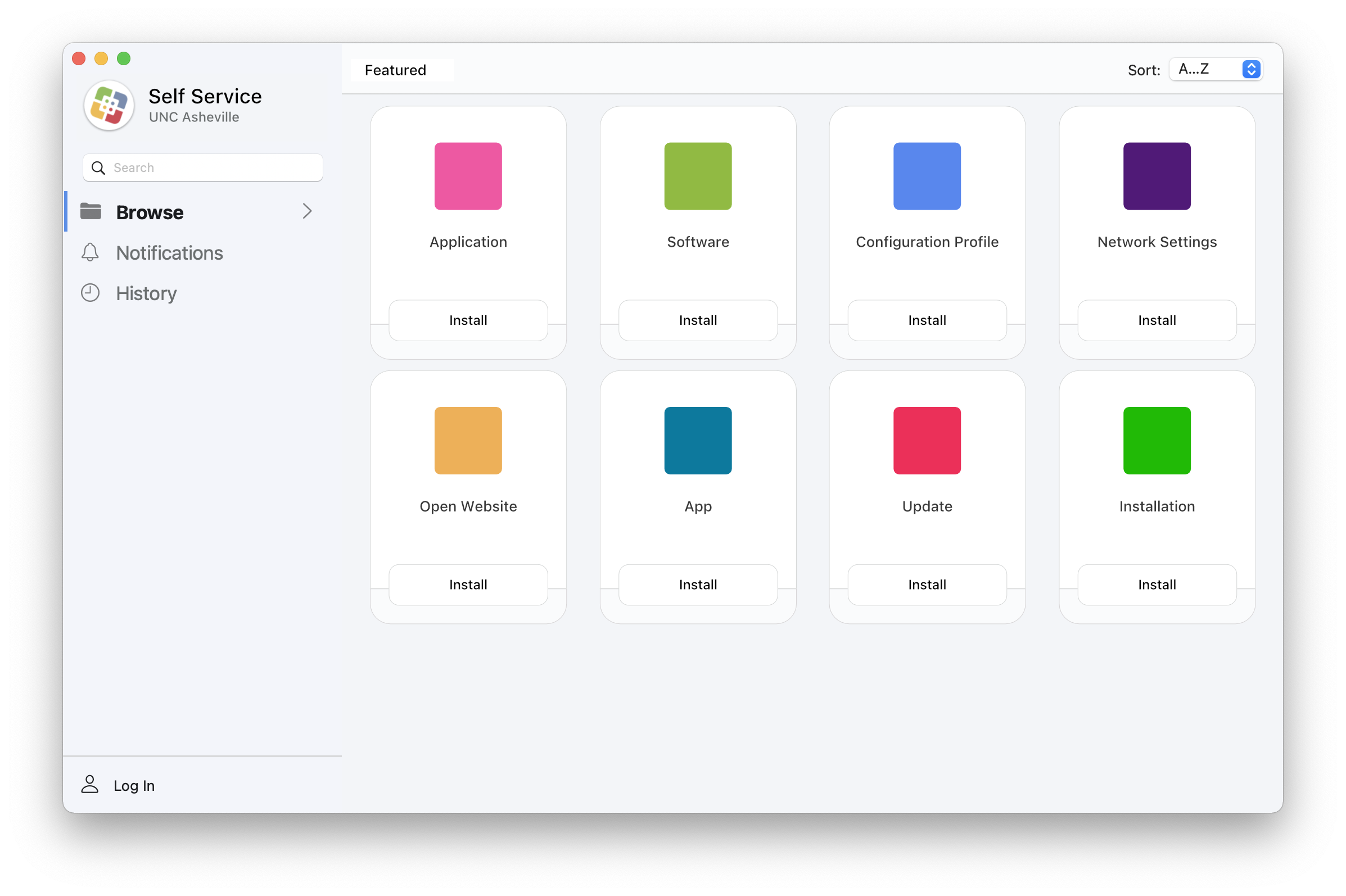 Self Service is a custom App Store just for UNC Asheville Mac users. You can use Self Service to install common apps, update your Mac, and run helpful troubleshooting utilities.