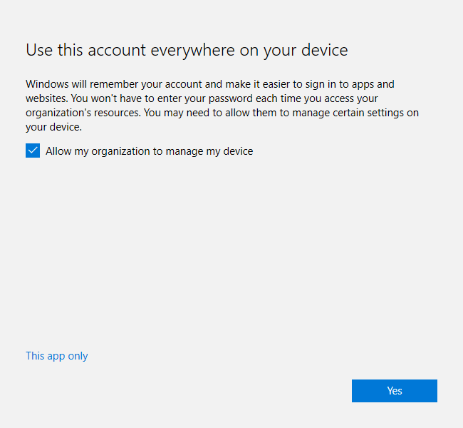 - You may be asked if you'd like to "Use this account everywhere on your device." This can make accessing and logging in to some aspects of your UNC Asheville Office 365 subscription easier. Click Yes.