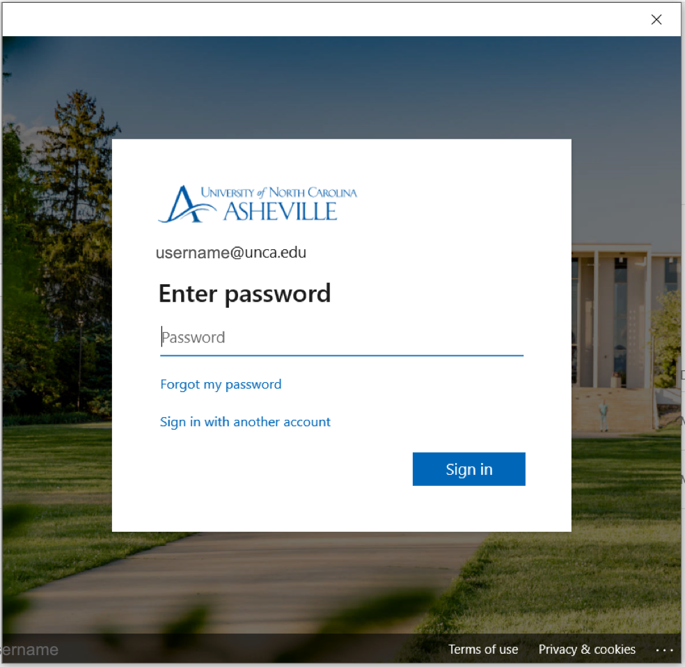 Enter your UNC Asheville password, then click Sign in. This is the same password you use to access all UNC Asheville services.