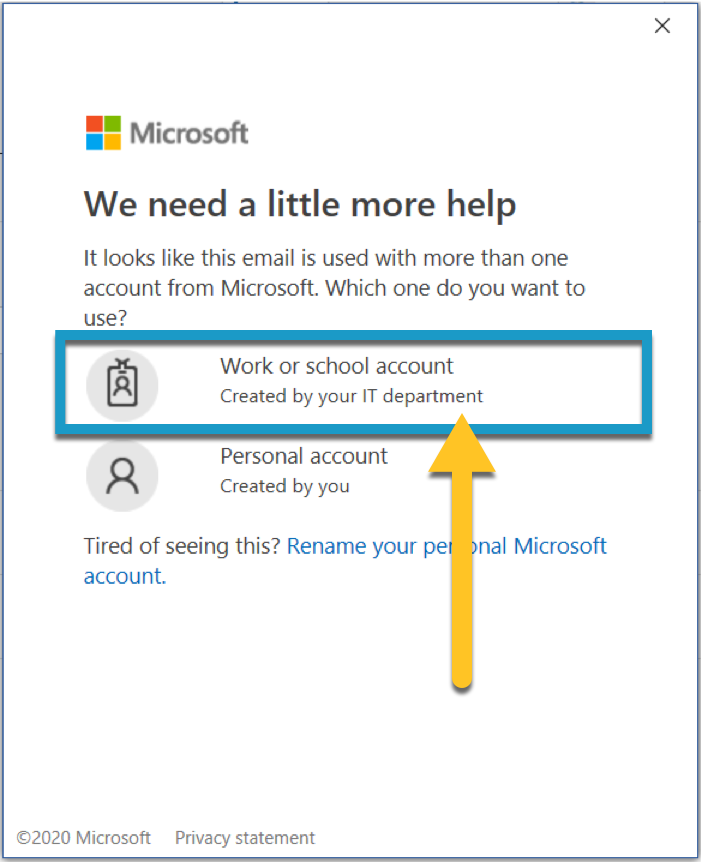 If you've set up a personal Microsoft account using your university email address, you may be prompted "We need a little more help." This occurs when Microsoft detects the existence of both your UNC Asheville account, and your personal consumer account.
