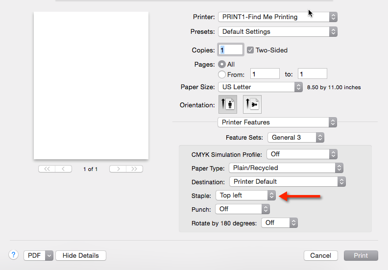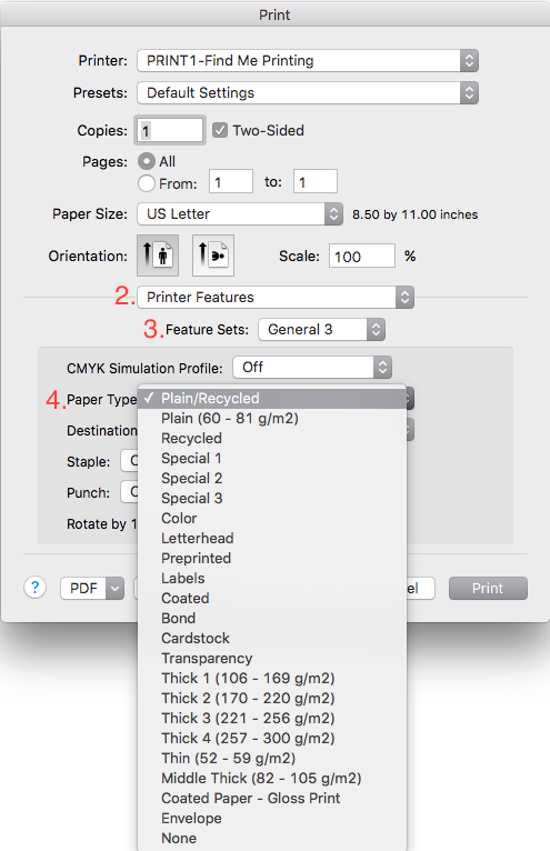 If you don't see the following options for your printer, use Self Service > Printing > Add a Printer to re-install that printer for the most up-to-date configuration.