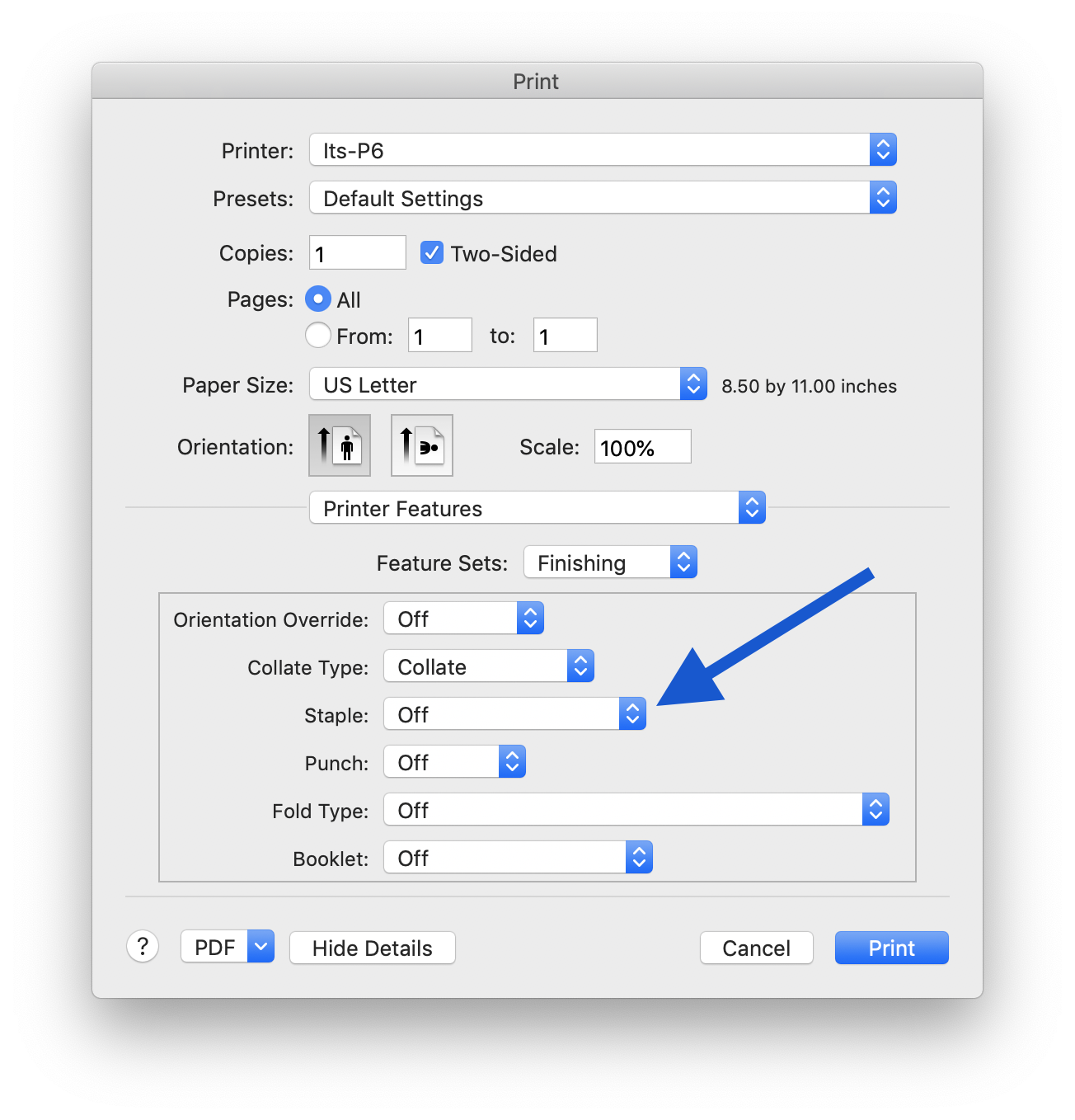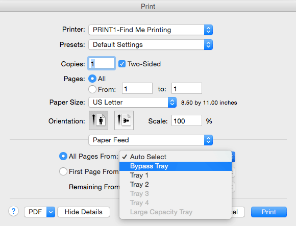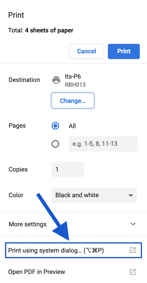 Print your document. If the app you're using provides its own printing dialog (such as Google Chrome, or Adobe Acrobat, etc), select "Print using System Dialog..."