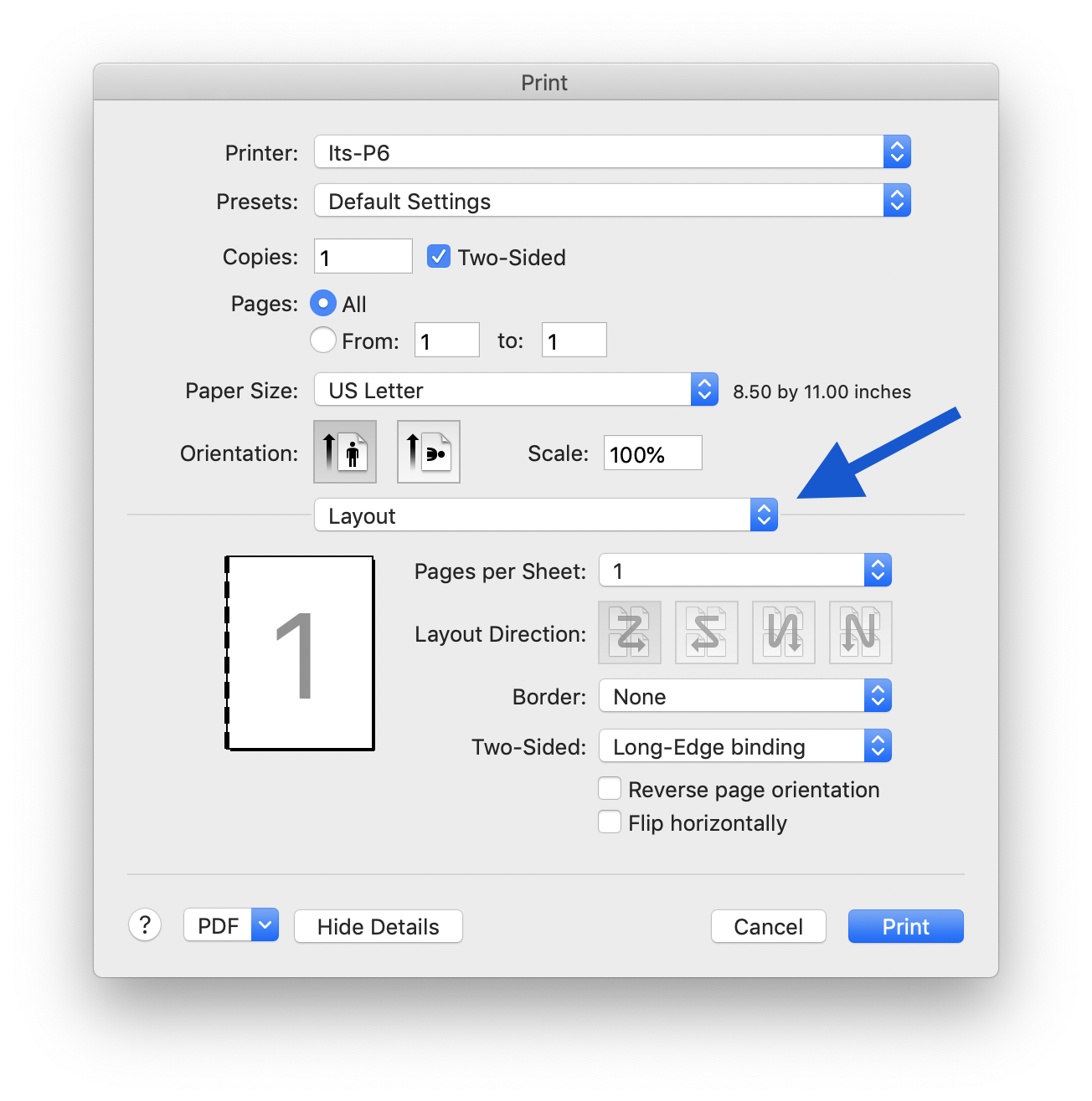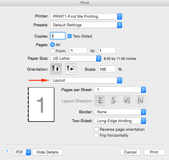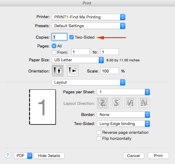 Duplex, or two-sided printing is enabled by default. To disable duplex printing and print single-sided, simply uncheck the two-sided checkbox.