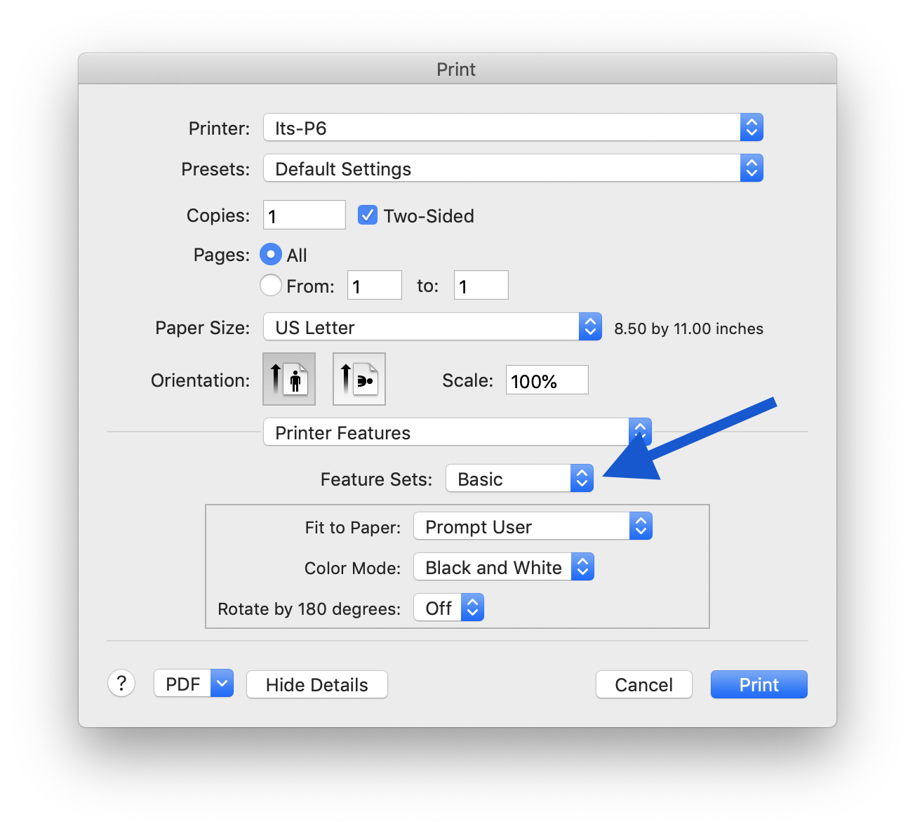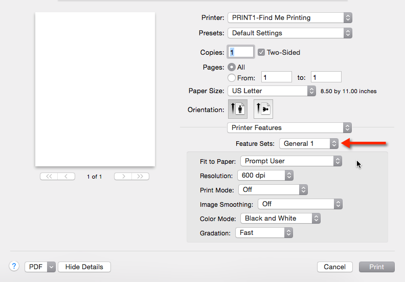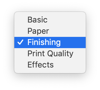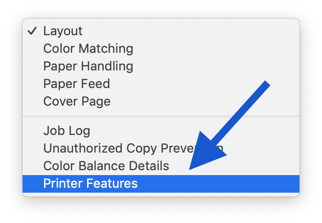 In newer versions of macOS, the printer features are not organized by "feature sets" – instead, all options are displayed in a scrollable window. No scrollbar is displayed but you may scroll your mouse over the option area to find the relevant settings.