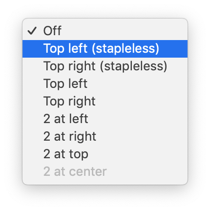 Beside "Staple" select "Top left (stapleless)" or "Top right (stapleless)" at your preference