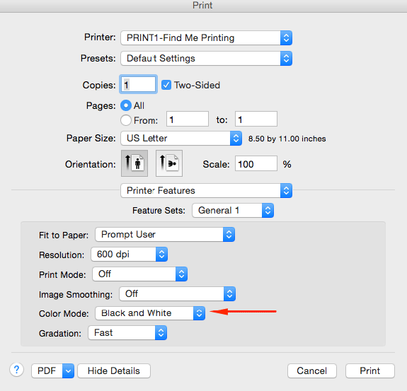 Click the Color Mode drop down to select "Black and White" or "Color"