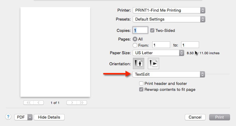 In the Print dialog, select the drop-down menu labeled with the application's name.