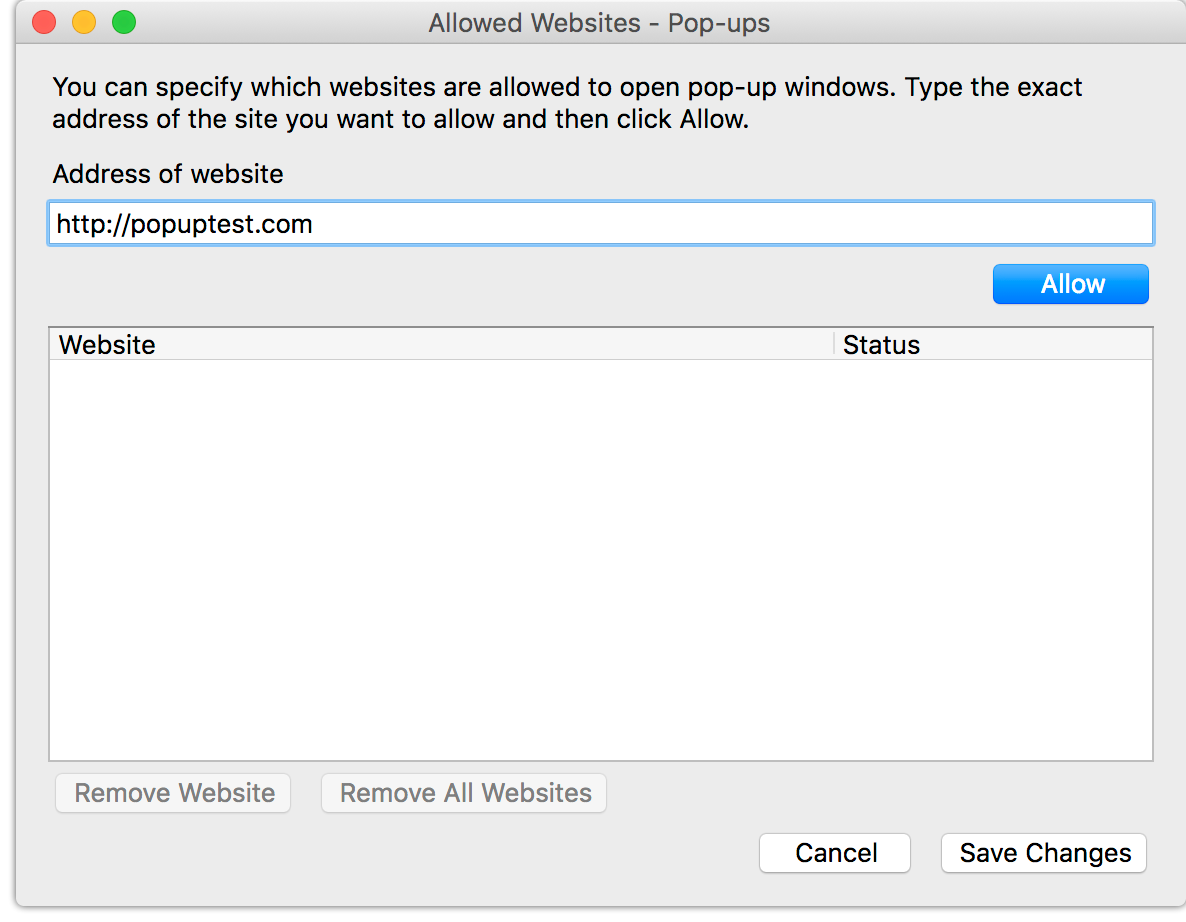 Use the "Allowed Websites - Pop-ups" window to manage sites allowed to display pop-up windows.