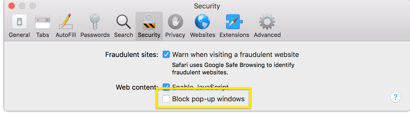 This is an insecure setting, and you should only disable Safari's pop-up blocker when you're actively using a site that requires allowing pop-ups. When you finish using that site, you should re-enable Safari's pop-up blocker.
