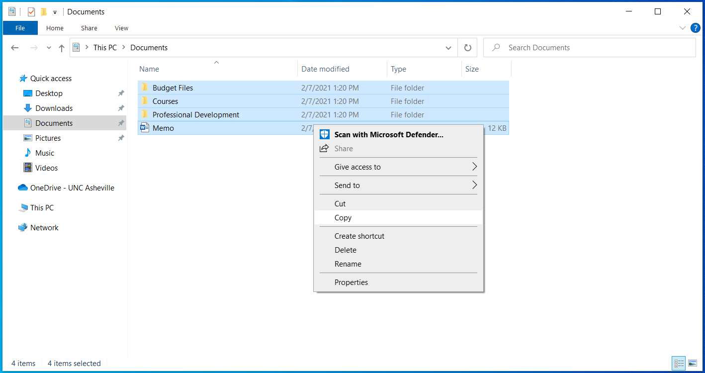 This example shows files located in the Documents folder. You may have files in multiple locations; these steps outline the general process for copying files to OneDrive. - Select the group of files you want to copy to OneDrive, then right click one of the files. Click Copy.