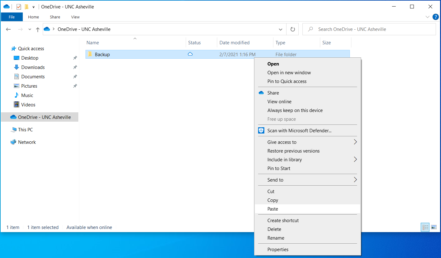 - Right click the Backup folder, then click Paste.