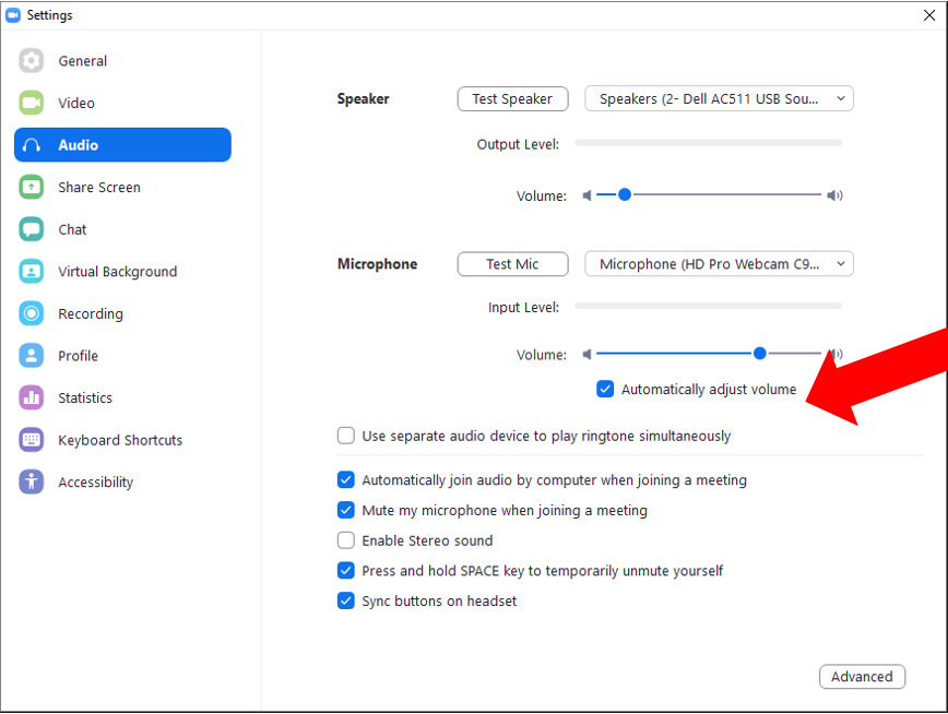 - Un-check the box beside "Automatically Adjust Volume" and adjust the microphone volume manually.