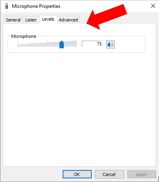 - In the "Microphone Properties" pop-up, select the levels tab. Adjust the mic volume and click "Apply"