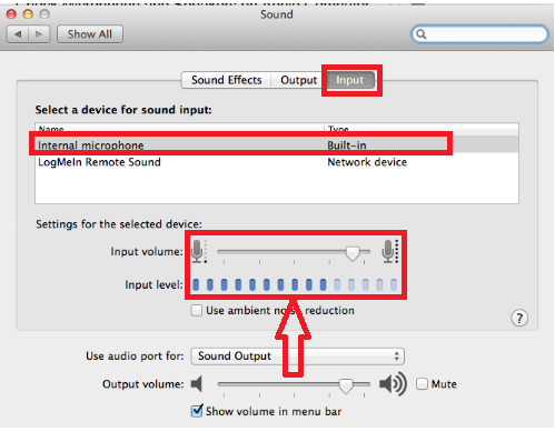 - Select the Input tab. Chose the microphone you are using from the list, and adjust the volume using the slider.