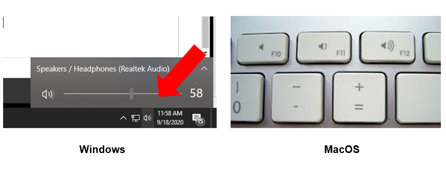 - Adjust computer volume from the Volume icon at the bottom of the screen (Windows) or using the keyboard volume buttons (MacOS).