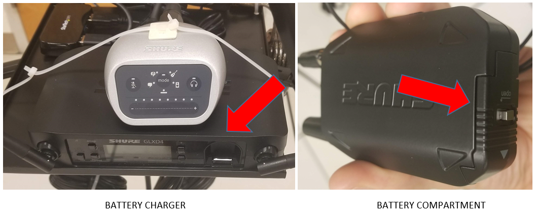 Install microphone battery Remove the battery from the front of the mic receiver by pressing the latch below the battery charger. Open the battery compartment on the bottom of the microphone transmitter and insert the charged battery. Close the battery compartment.