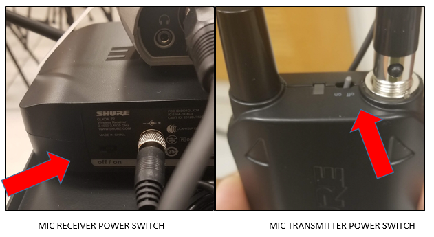 3. Turn On Microphone Turn on the microphone receiver using the switch on the back of the unit with the antennas. Turn on the microphone transmitter with the switch at the top of the bodypack. Attach the mic to your shirt and the transmitter to your waist or pocket. Once connected, a blue light will appear on the front of the receiver.