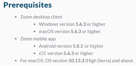 Below is an example of the minimum Zoom software requirements for a Zoom Meeting function.