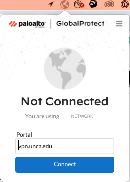 Click on the GlobalProtect client in the system tray, make sure “vpn.unca.edu” is selected as the portal, and click Connect