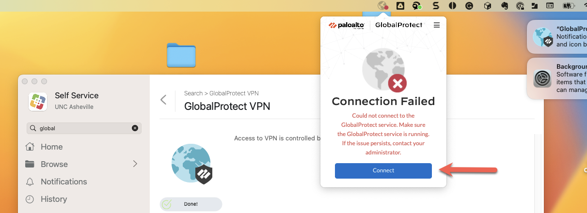 When Global Protect is first installed on a Mac or when logging in you may see a message like the one below. In that case, just ignore it and hit “connect” to retry the connection and it should connect you.
