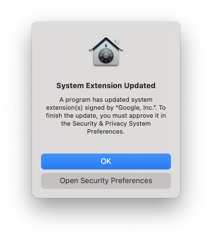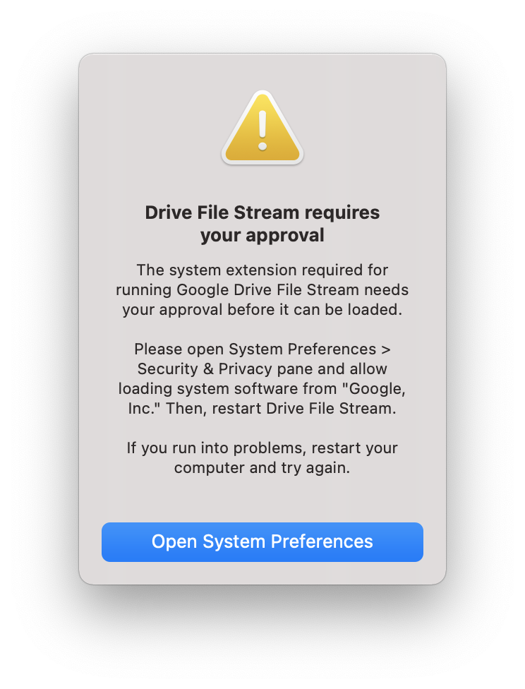 The first time you open Google Drive, you may see three notifications about a System Extension.