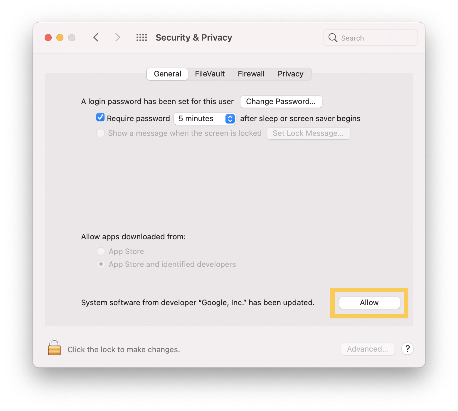 Click the Allow button beside "System software from developer 'Google, Inc.' has been updated."