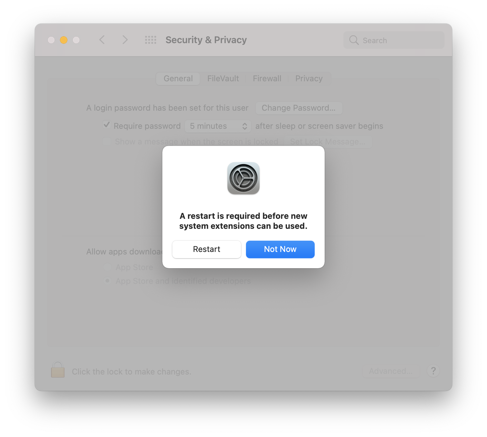 Click Open System Preferences. The System Preferences app opens to Security & Privacy settings.