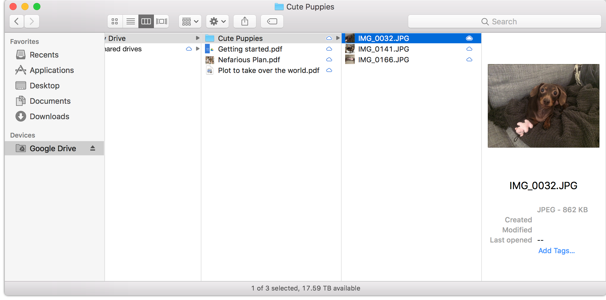 Drive File Stream is fully integrated with Finder. Files stored in Google Drive will display previews and useful metadata, just like any other file on your Mac.
