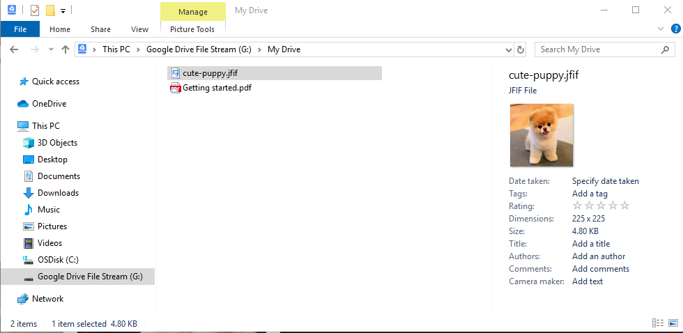 Drive File Stream is fully integrated with Windows Explorer. Files stored in Google Drive will display previews and useful metadata, just like any other file on your Windows computer.
