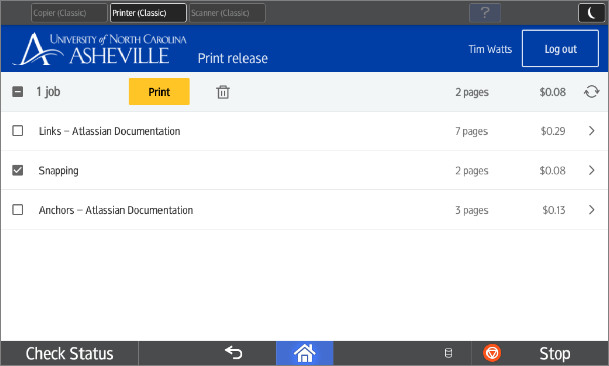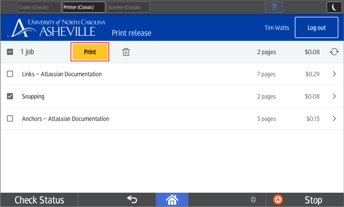 Helpful Hint: If you would like to select / unselect all jobs tap the checkbox at the top of the list of print jobs.Press the Print button after making your selection[s].