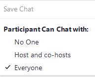 Note: When sending messages to an individual participant, private chats are never visible to the meeting's host. Additionally, if the hostsaves the chat, private messages between participants do not appear on the chat transcript.
