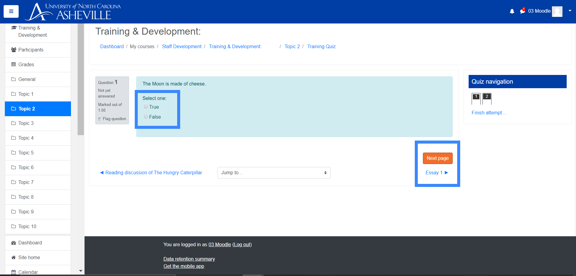 - Select answers to quiz questions, and use the "Next Page" button to navigate to the next question.