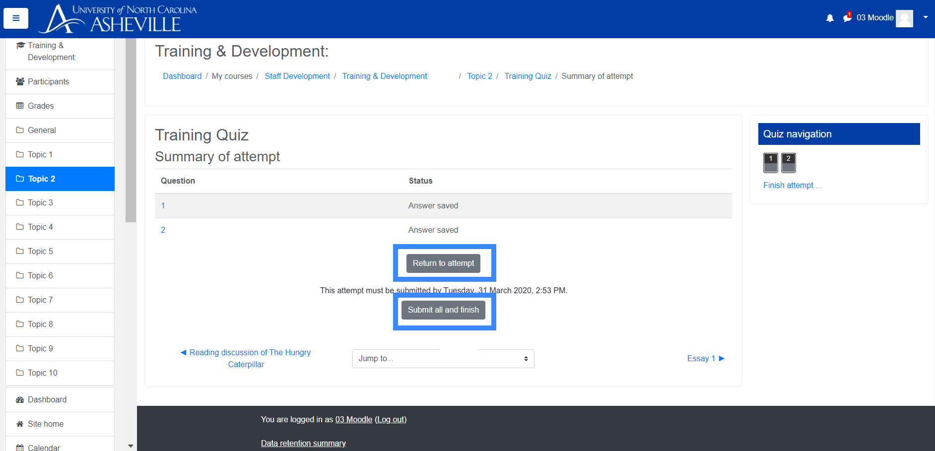 - On the "Summary of attempt" page, you can click "Return to Attempt" to modify your responses, or "Submit all and finish" to submit your quiz attempt.