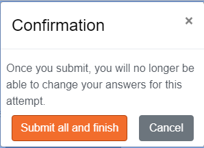 - After clicking "Submit all and finish" you will be prompted with a confirmation asking if you are sure you want to finish. Click "Submit all and finish" to complete the quiz.