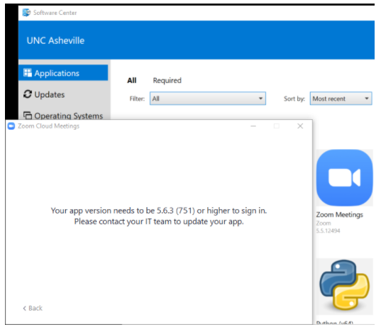 Campus members should contact the IT Service Desk if the Zoom Software client is not available for download. Service Desk staff will assist users in updating the software portal version on their computer, as well as any other issues preventing successful software updates. Use the following email address to submit a service desk ticket ITservicedesk@unca.edu