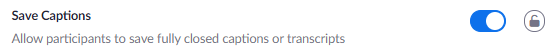 | Step 4 | Hosts also have the ability to disable Save Transcript. Click to toggle off Save Captions in the Settings tab of the Zoom Web application. This feature is enabled for all users within the UNC Asheville campus-wide Zoom account. |