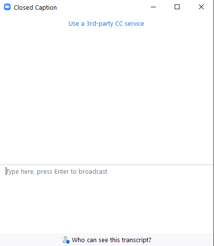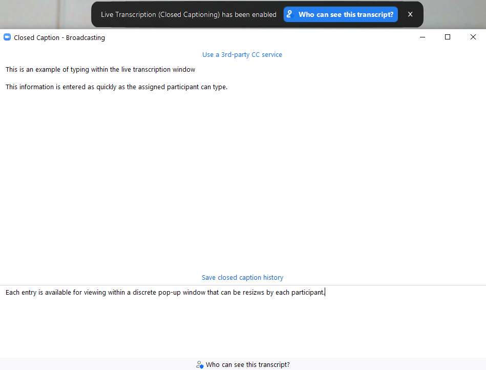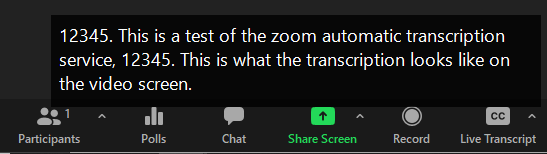 The presenter(s) spoken audio can be transcribed within Meetings and webinars either by assignment of a participant who types what they hear, or by automatic (robot) transcription services, which enables speech to text transcription. This feature must be enabled by the host of the meeting or webinar once the event begins. Automatic transcription services currently support only participants speaking the English language. While Zoom Video Communication systems provide assistive technology solutions for Zoom platform users (Zoom Meeting and Zoom Webinar), these solutions are not intended to replace purpose built ADA accommodation services or systems for any compliance needs.