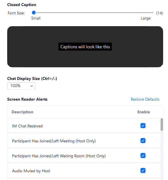 | Step 2 | Live Captioning settings are available for use that allow for font size and Chat display size changes, as well as selection of Screen Reader alerts. |