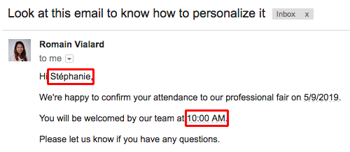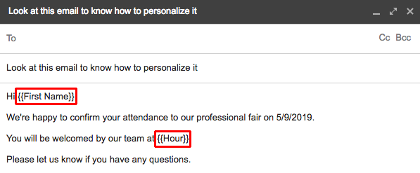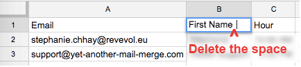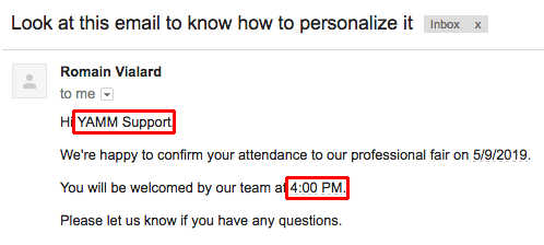 Caution: The name inside your marker {{}} must match exactly the column header of your spreadsheet, as YAMM is case sensitive.