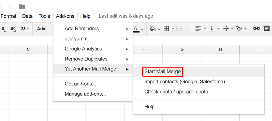 That's it! Your template is now ready to be used in YAMM. Go to 'Add-ons > Yet Another Mail Merge > Start Mail Merge':