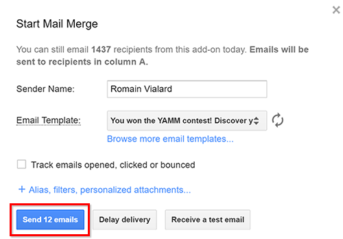 Once you're ready, simply hit the 'Send Emails' button to send your mail merge to your recipients: