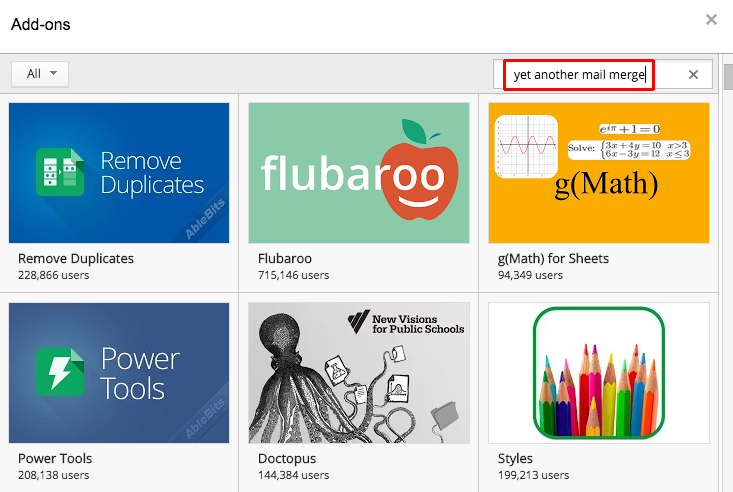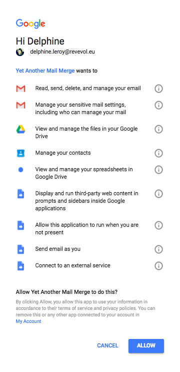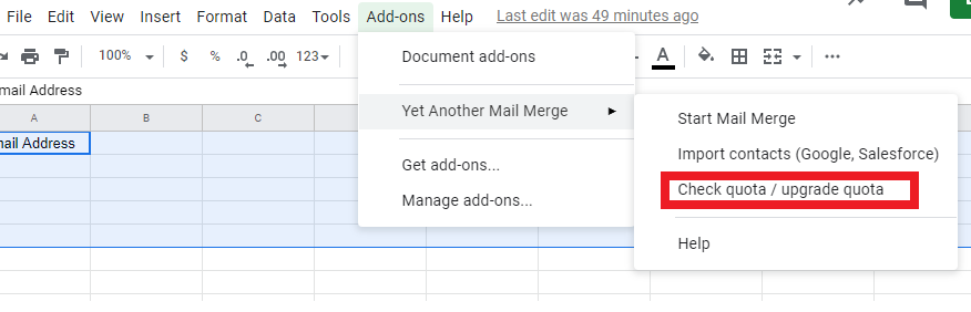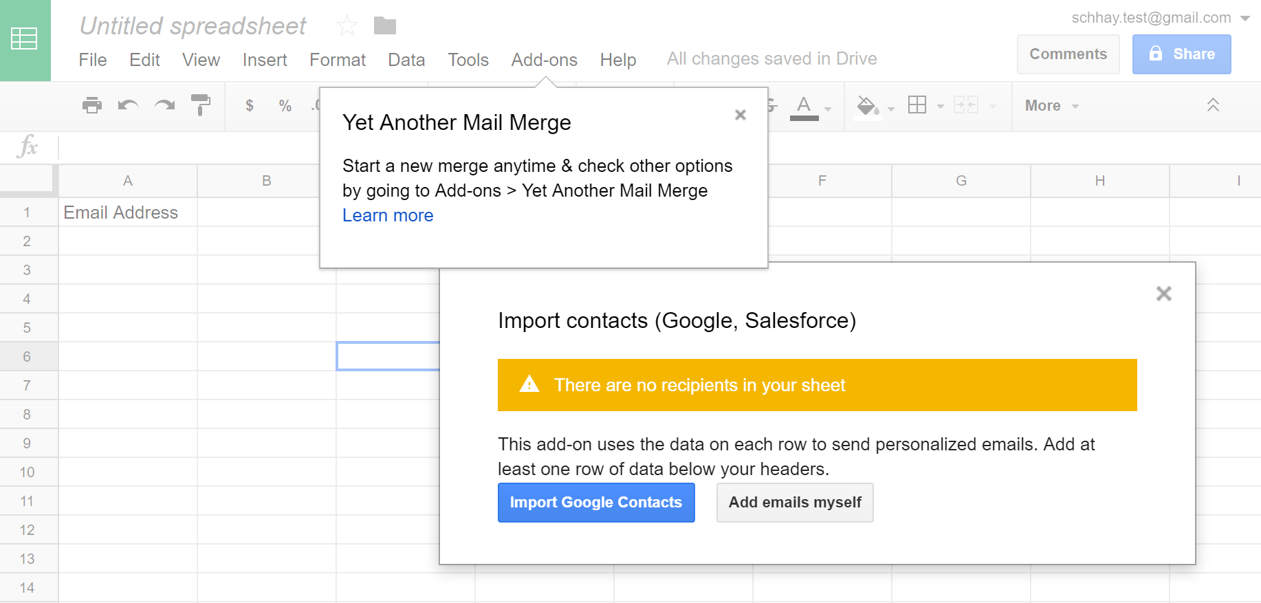Once you installed Yet Another, two pop-ups will appear on your spreadsheet. You should then see the new entry 'Yet Another Mail Merge' under the add-ons menu: