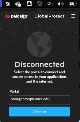 Click on the GlobalProtect client in the system tray, make sure “nonagencyvpn.unca.edu” is selected as the portal, and click Connect