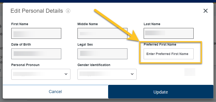 The update personal information window will appear. Fill out the Preferred First Name field and click Update