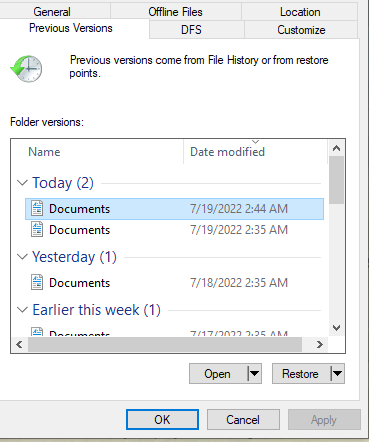 - You'll see a list of available previous versions of the file or folder. The list will include files saved on a backup as well as restore points, if both types are available.