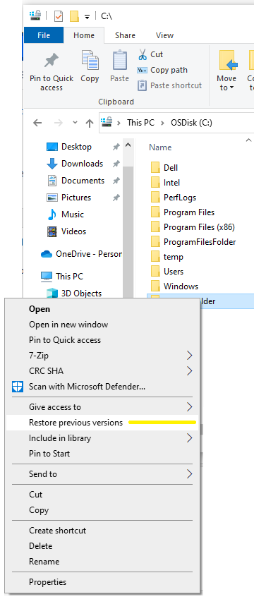 - Navigate to the folder that used to contain the file or folder, right-click it, and then click Restore previous versions. If the folder was at the top level of a drive, for example C:\, right-click the drive, and then click Restore previous versions.