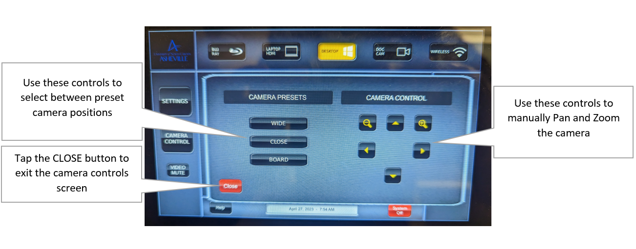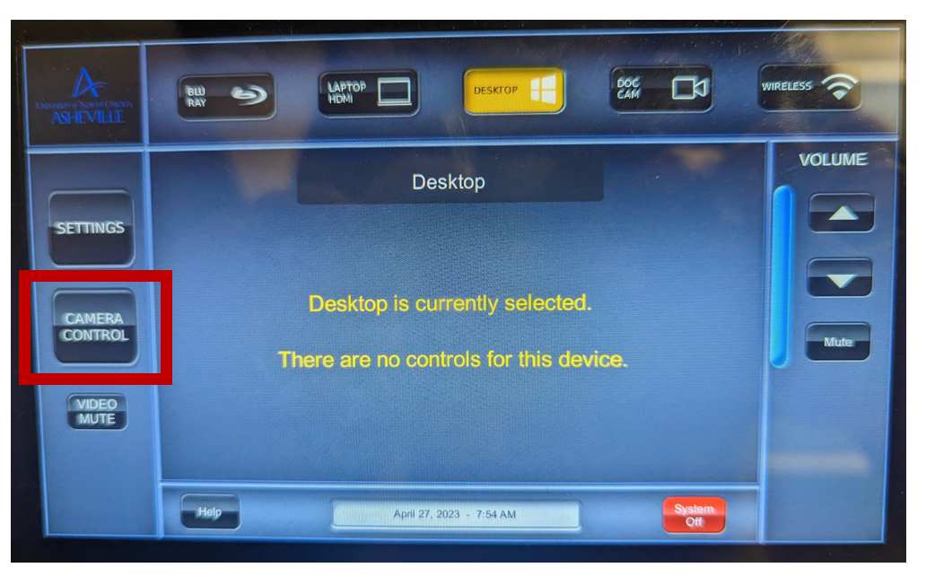 Once you have the classroom turned on, select the CAMERA CONTROL button on the touch screen to open the camera controls