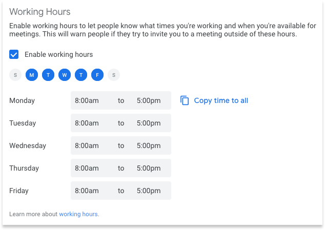 Google Calendar allows you to set your working hours to help colleagues understand your availability for appointments and meetings. With Working Hours enabled, Google Calendar will automatically warn people if they try to schedule a meeting for a time when you won’t be working.