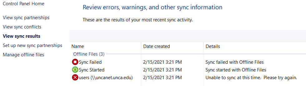 Sync Center should not be trusted as a true backup. It is intended to make your files available on multiple devices, but it is prone to issues, especially with sync conflicts and sync errors. For a true backup, we recommend using Google Drive or OneDrive.