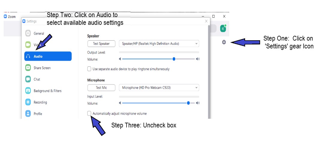 Open the Zoom Desktop Client. Steps to disable the 'automatically adjust microphone volume': Step One: Click on the Settings gear icon; Step Two: Click on Audio (headset) icon to select available audio settings; Step Three: uncheck the box adjacent to 'Automatically adjust microphone volume' setting.